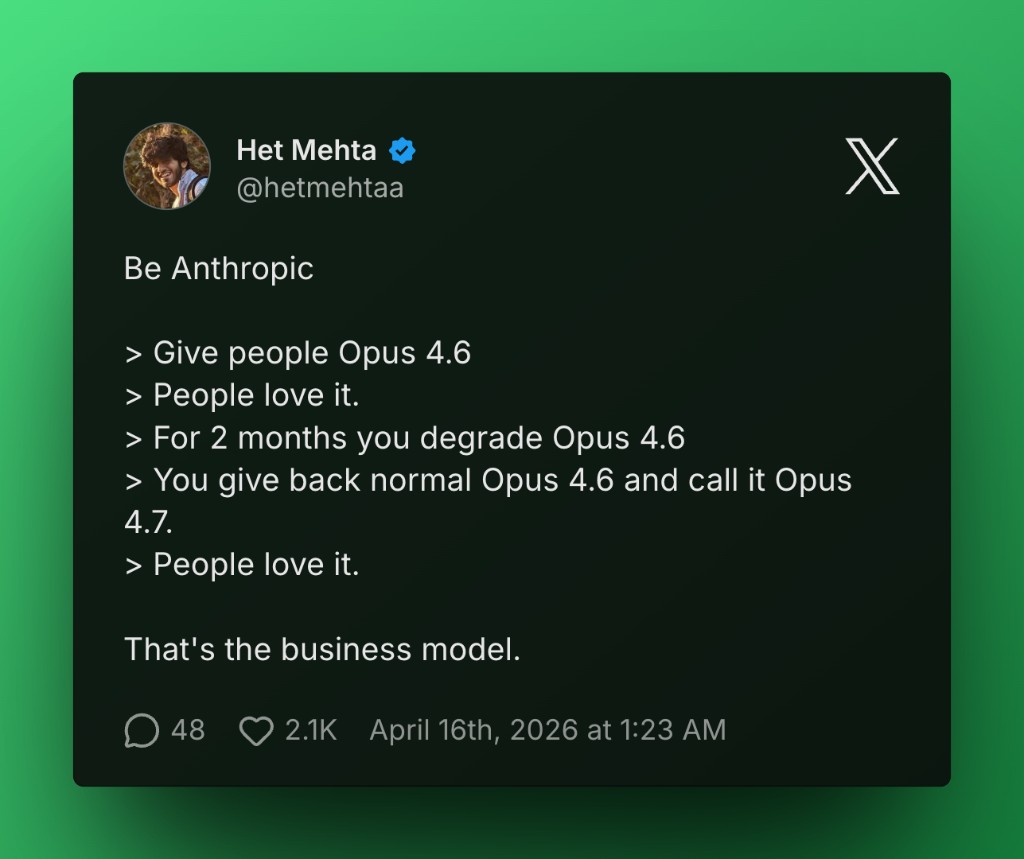 The community feedback has been… mixed. The new tokenizer is more efficient in some ways but uses 10-35% more tokens for the same input in others. Output might get better, but you'll pay for it. This is why we obsess over model comparison.