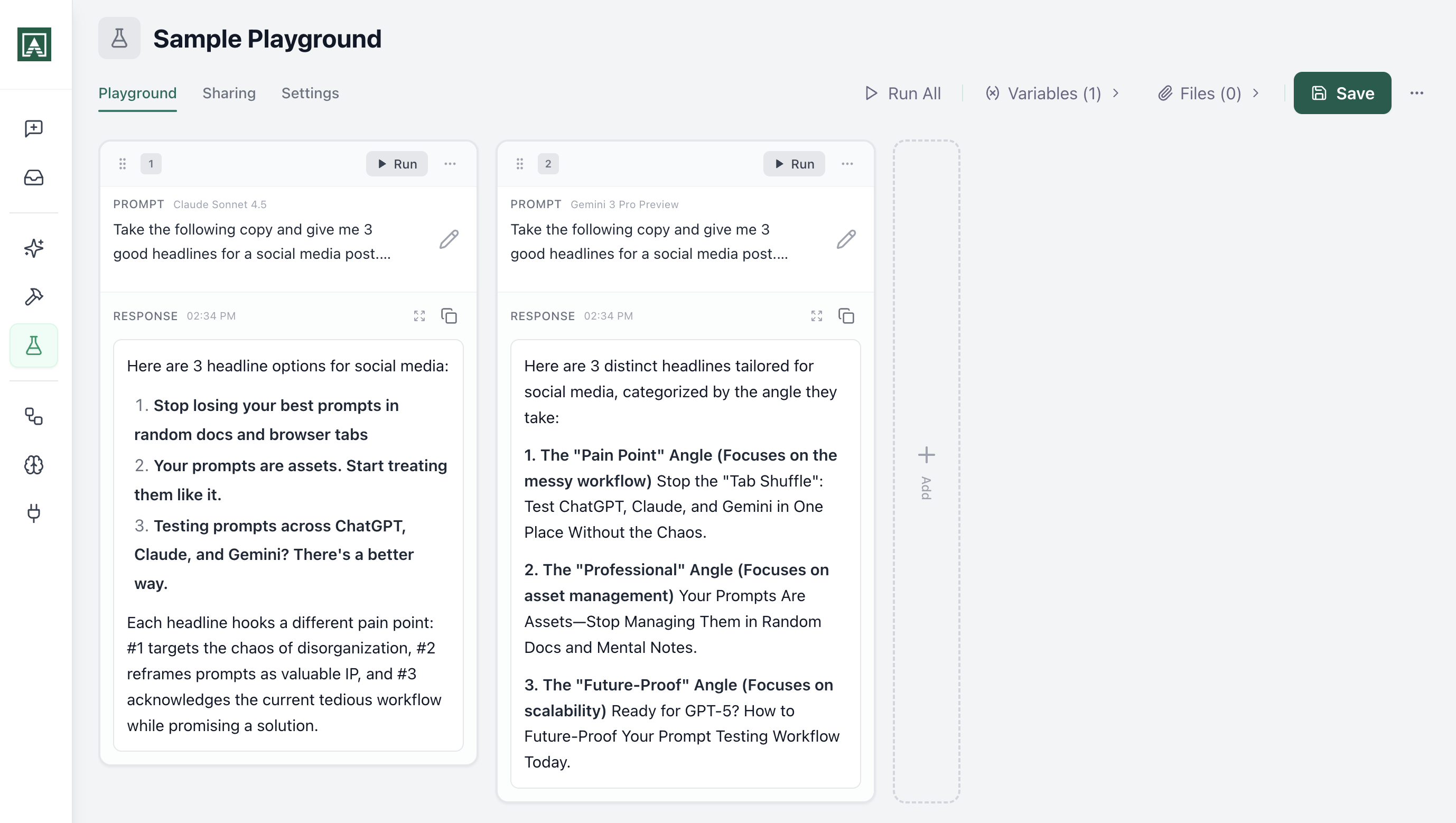 Save responses. Share them with your team. Track how a prompt works over time. If you're building components that need to work reliably, Playgrounds are where you prove it.