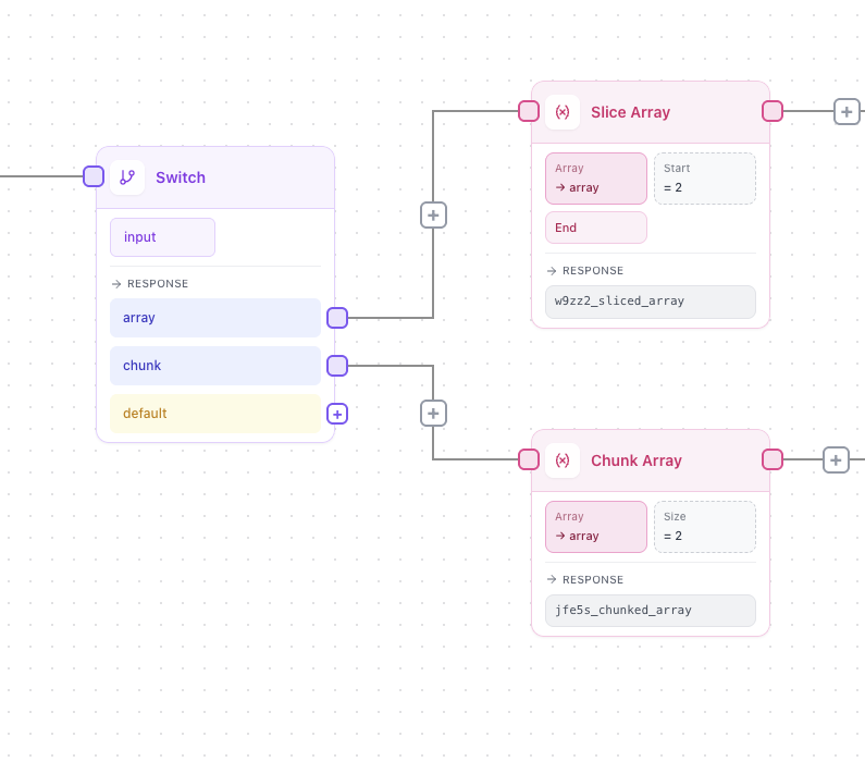 Chunk, slice, length, includes, unique, flatten, and flatten-to-object. Array Chunk is particularly useful for batching. You can split a large list into groups of N before fanning out to parallel nodes. Array Unique quietly solves a lot of deduplication headaches you'd otherwise handle in code.