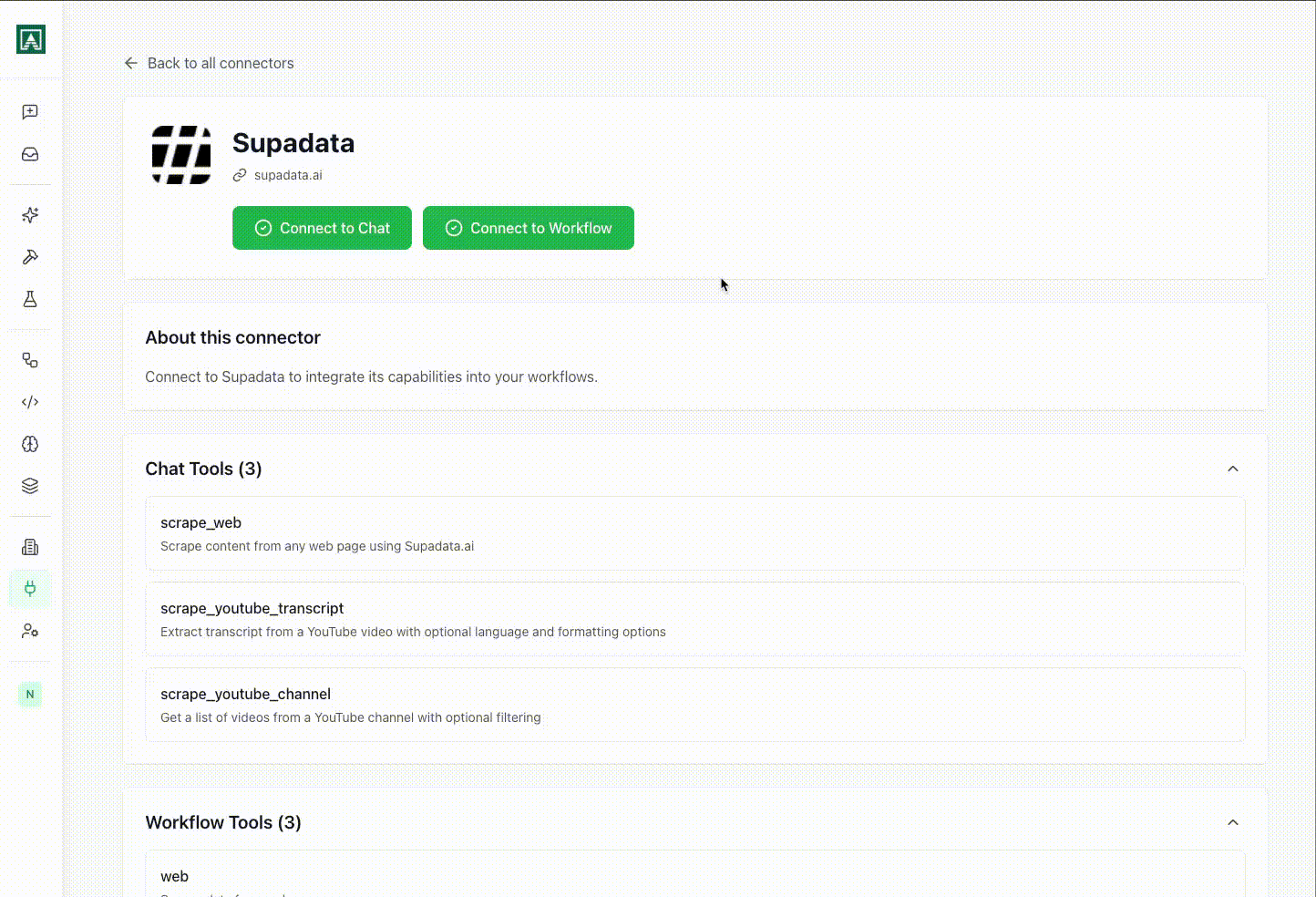 Go to Connectors in your Aisle workspace. Scroll down to find Supadata and click Connect. You'll need a Supadata API key. If you don't have one, sign up here and grab your key from their dashboard.