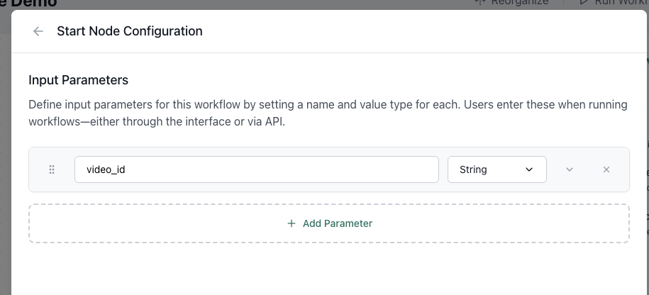You'll see a blank workflow canvas with a Start node already there. The Start node is important—whatever inputs you define here become the parameters people provide when they run it.