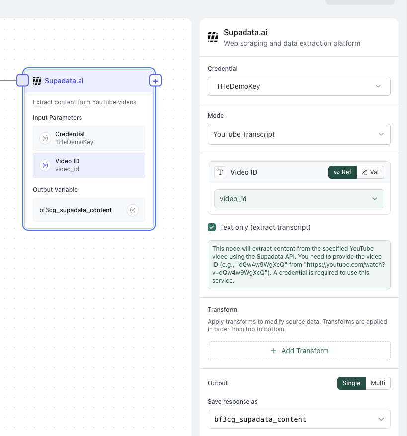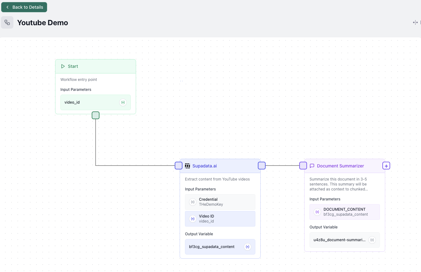 The sample workflow pulls the transcript, runs it through an LLM to summarize or extract what you need, and optionally stores it for later reference. Once built, you can run it on any video. Your team can too.