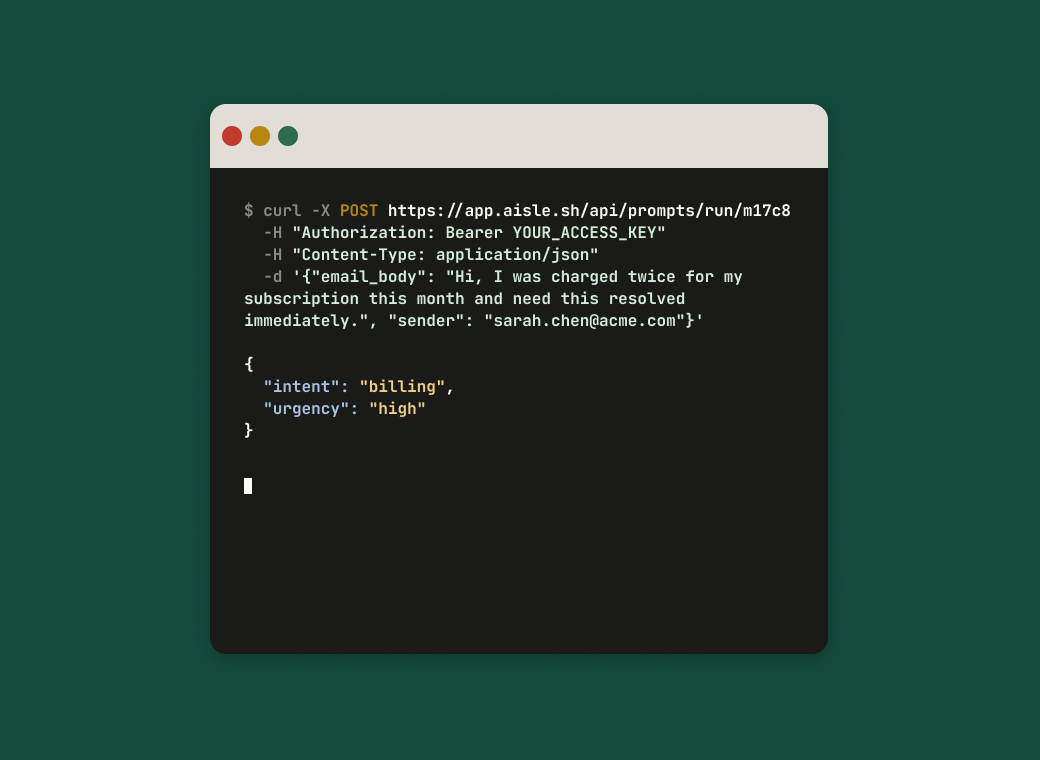 A prompt you refine in chat becomes an API endpoint with one toggle. POST with your variables, get the response back. The same prompt serves the team in chat and your application in production.